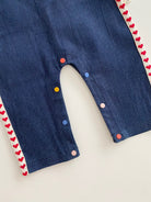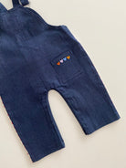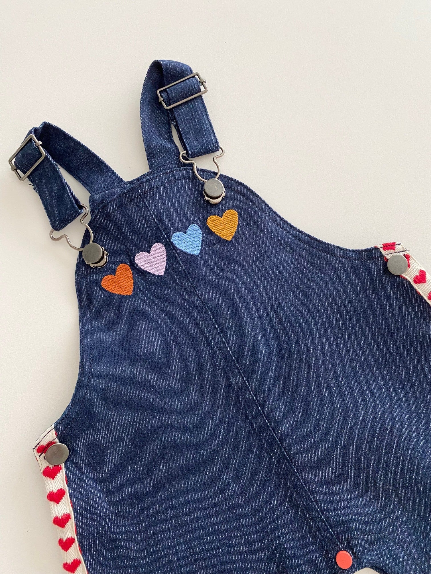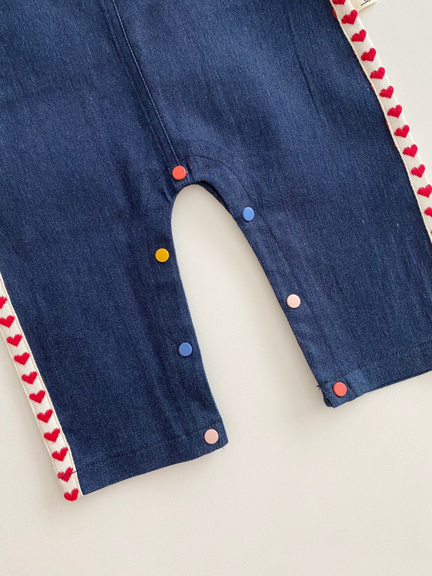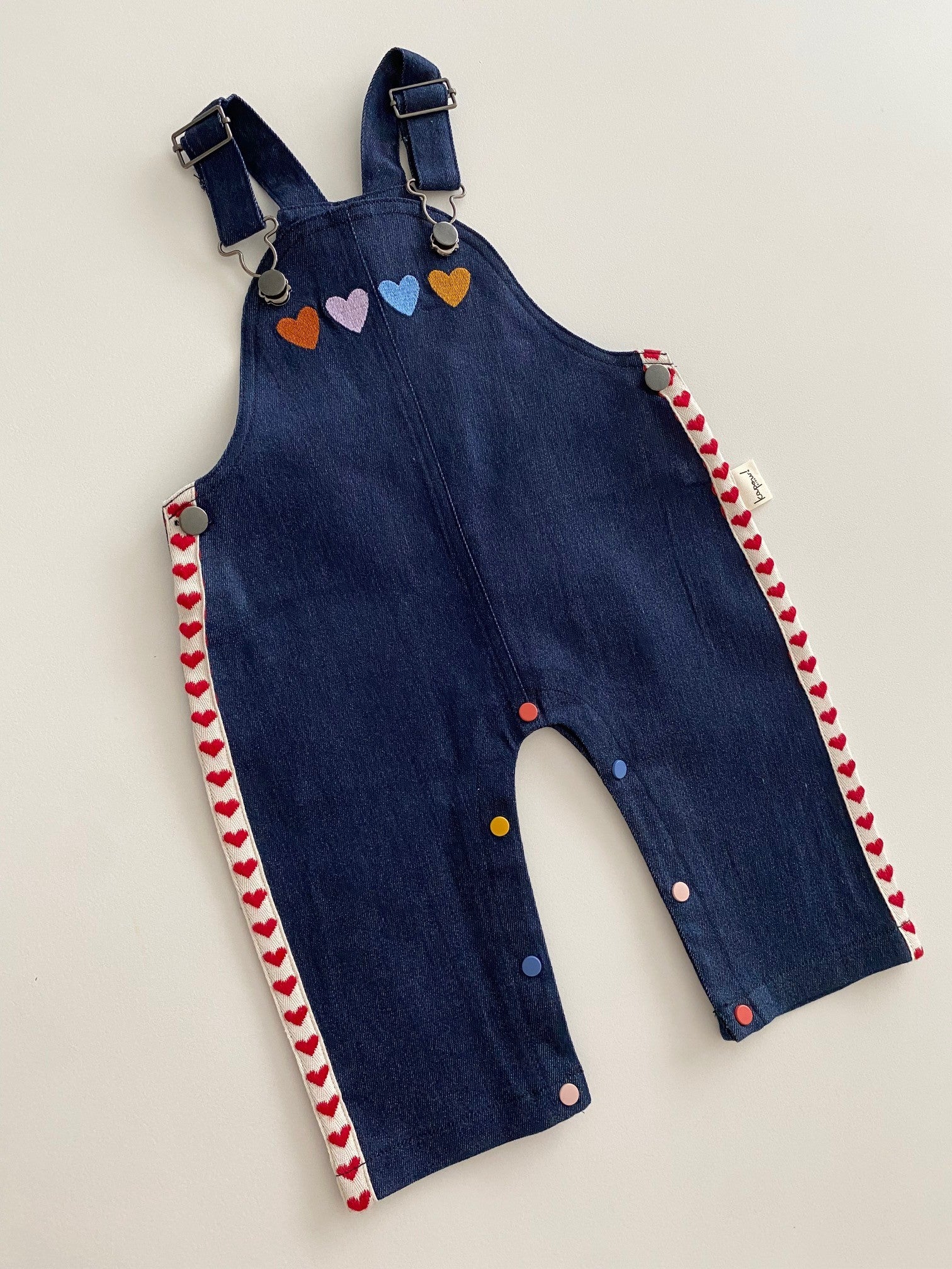 These adorable denim overalls are a wardrobe essential with serious style credentials. Featuring vibrant rainbow snaps at the crotch, sweet heart embroidery, and a fun heart tape stripe running down the leg, they're perfect for kids who love to make a statement. The classic dark denim keeps things cool and versatile, while the colourful details add that playful pop every outfit needs. Comfortable, durable, and undeniably cute—your little one will want to wear these everywhere!