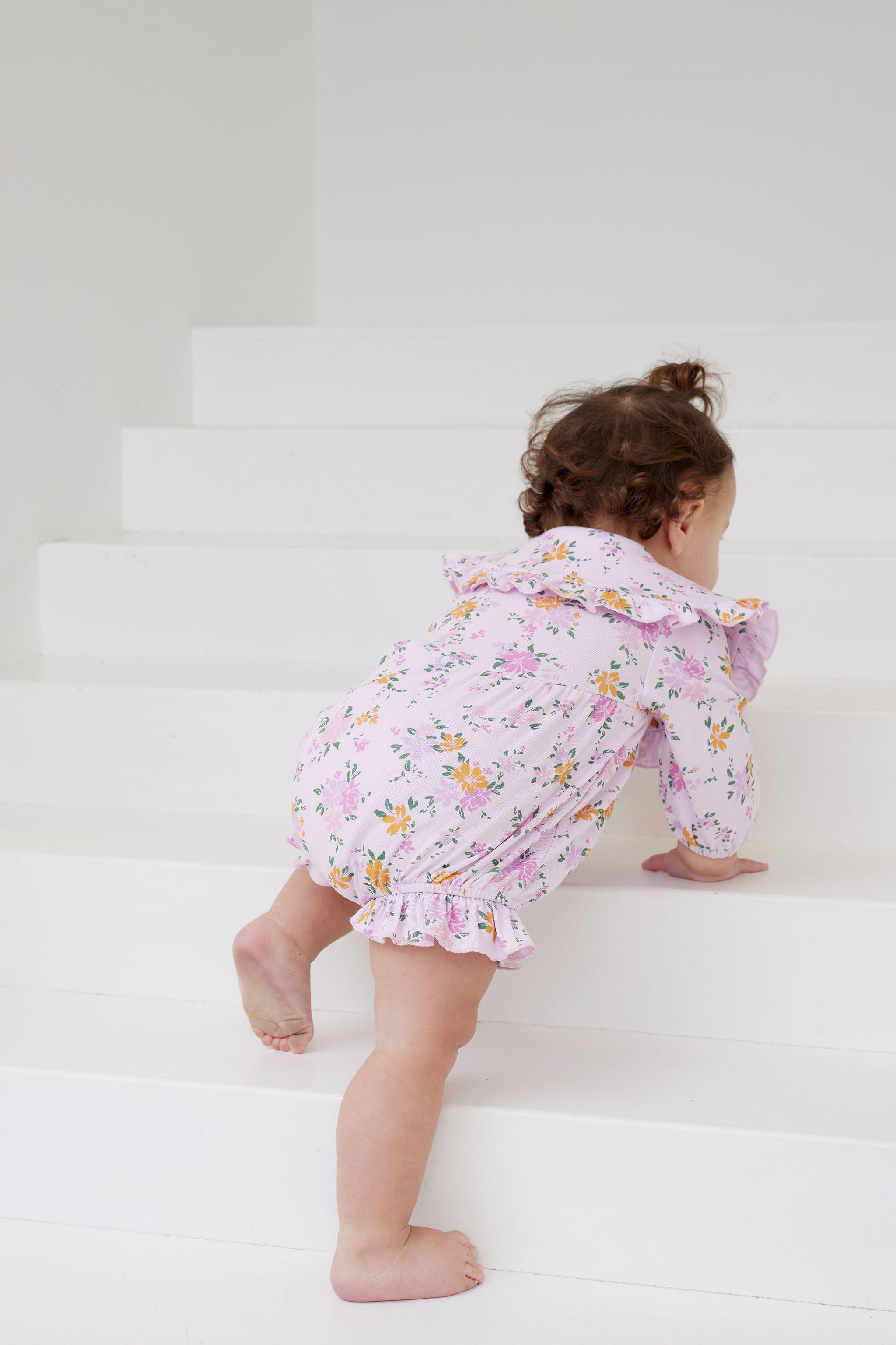 For a softer touch, our lilac floral romper with a statement ruffle collar and delicate frills offers timeless sweetness with a vintage feel.